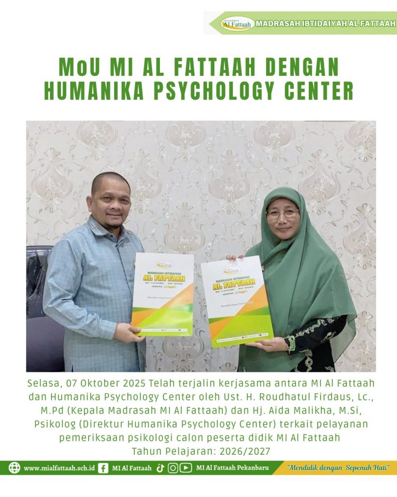 Alhamdulillah, pada Selasa, 7 Oktober 2025, telah terjalin kerja sama antara MI Al-Fattaah Pekanbaru dan Humanika Psychology Center dalam bidang pelayanan pemeriksaan psikologi calon peserta didik baru Tahun Pelajaran 2026/2027.
