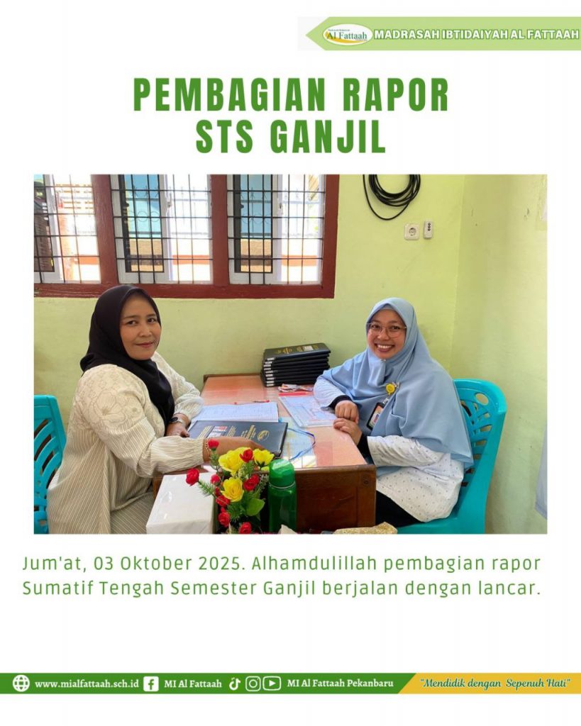 Alhamdulillah, pada hari Jum’at, 3 Oktober 2025, MI Al-Fattaah Pekanbaru telah melaksanakan kegiatan pembagian rapor Sumatif Tengah Semester (STS) Ganjil dengan tertib dan lancar.